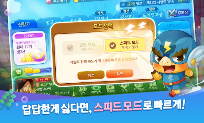 "한게임 신맞고"만의 독보적인 재미, 스피드 모드로 손에 착 감기는 '치는 맛'을 경험하세요. 빠르게 전개되는 박진감 넘치는 실시간 대전 속에서 긴장감을 만끽하고, 모두에게 공평한 원조 맞고룰로 오직 실력만이 승부를 가르는 진정한 공정함을 느껴보세요. 매 판마다 등장하는 특급 미션은 한 순간도 방심할 수 없는 짜릿함을 더해줍니다. 게임머니 걱정은 이제 그만! 매일 접속만 해도 포키의 출석부와 무료 캡슐을 통해 최대 1,500만냥을 획득할 수 있으며, 올인하더라도 매일 10회 고스톱 머니 무료 충전이 가능합니다. 영상 시청으로 최대 3억냥까지 얻어 큰 판 승부에도 언제든 도전하세요. 총 10억냥 이상의 무료 머니가 매일매일 당신을 기다립니다.
