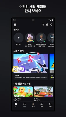 Roblox는 단순한 앱을 넘어, 상상하는 모든 것이 현실이 되는 광활한 디지털 우주입니다. 이곳에서는 전 세계 수백만 명의 크리에이터가 매일 새로운 세계, 게임, 모험을 끊임없이 만들어내며 모두를 위한 무한한 즐거움을 선사합니다. 친구들과 함께 미지의 공간을 탐험하고, 짜릿한 경쟁에 참여하거나, 자신만의 스토리를 만들어가는 등, 끝없는 몰입형 체험의 문이 언제나 열려 있습니다.